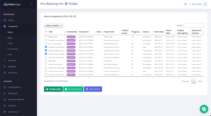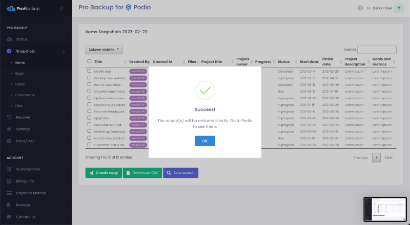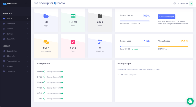 Pro Backup - formerly known as Backup & Restore - is a safe & easy-to-use backup app for Podio.