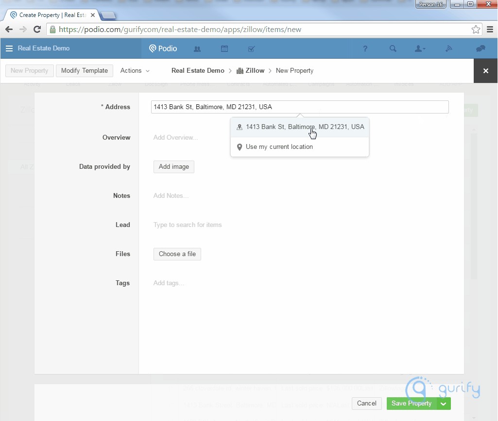 Tap into Zillow property information and comparables, automatically merge the data into Podio. Comparable properties report and comparables map will be attached automatically upon new item creation.