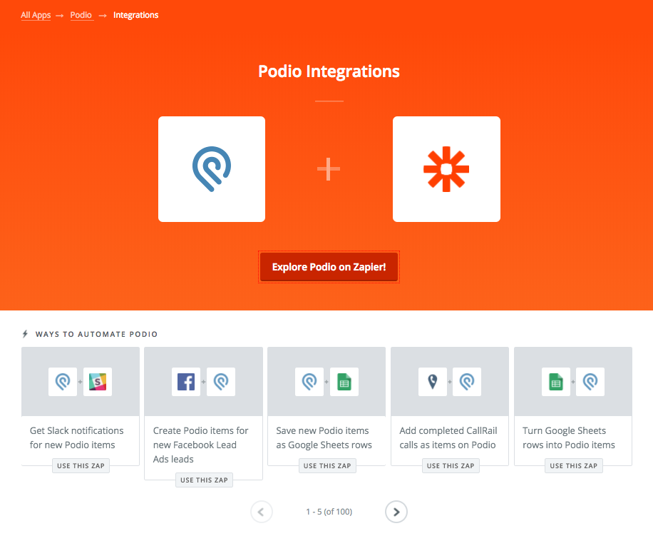 Zapier is a workflow automation tool that connects Podio and the work apps you use every day. Integrating with over 1,000 apps, Zapier builds processes that automate time-consuming tasks and boost productivity.