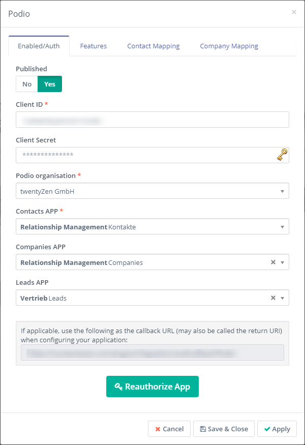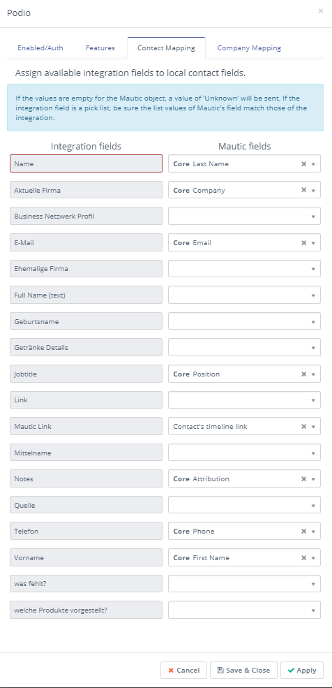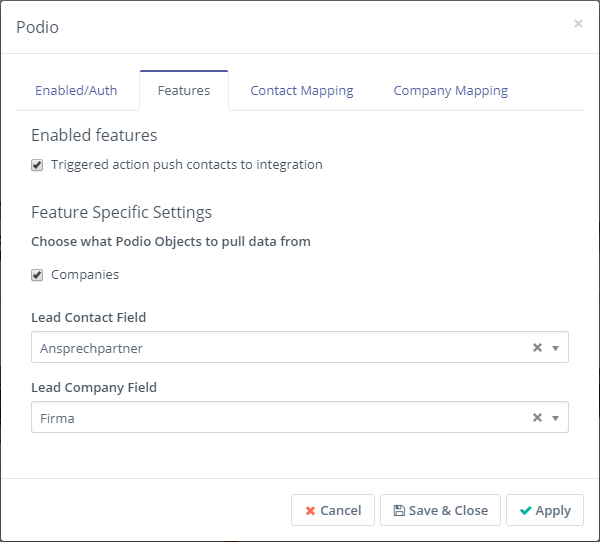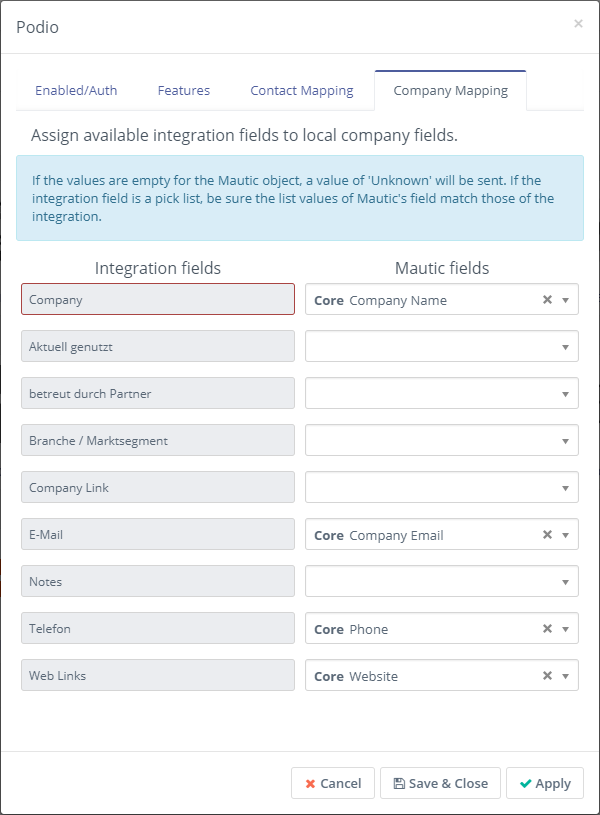 Marketing automation helps to qualify sales leads. The Community Edition of Mautic (Open Source) can be installed on your own server. Qualified leads are then transferred directly from forms or as results of campaigns into a Podio CRM application and lead apps. For example, the creation of a lead in Podio that is linked to a new or existing contact and a new or existing company is supported. The new contact is also automatically linked to the company.