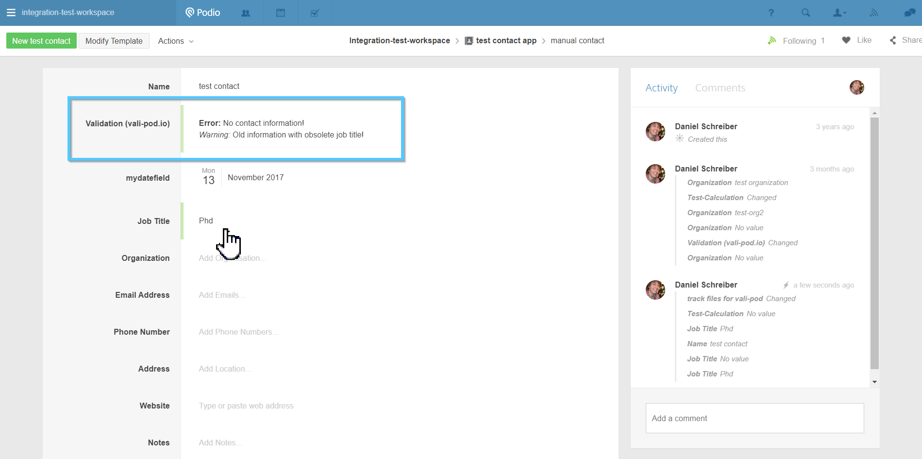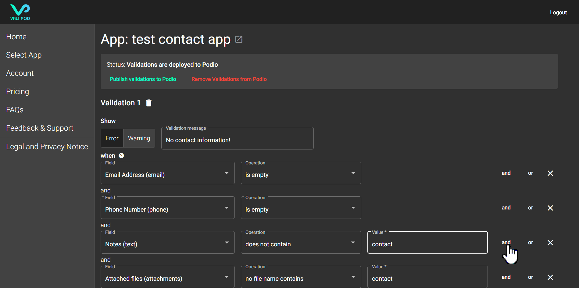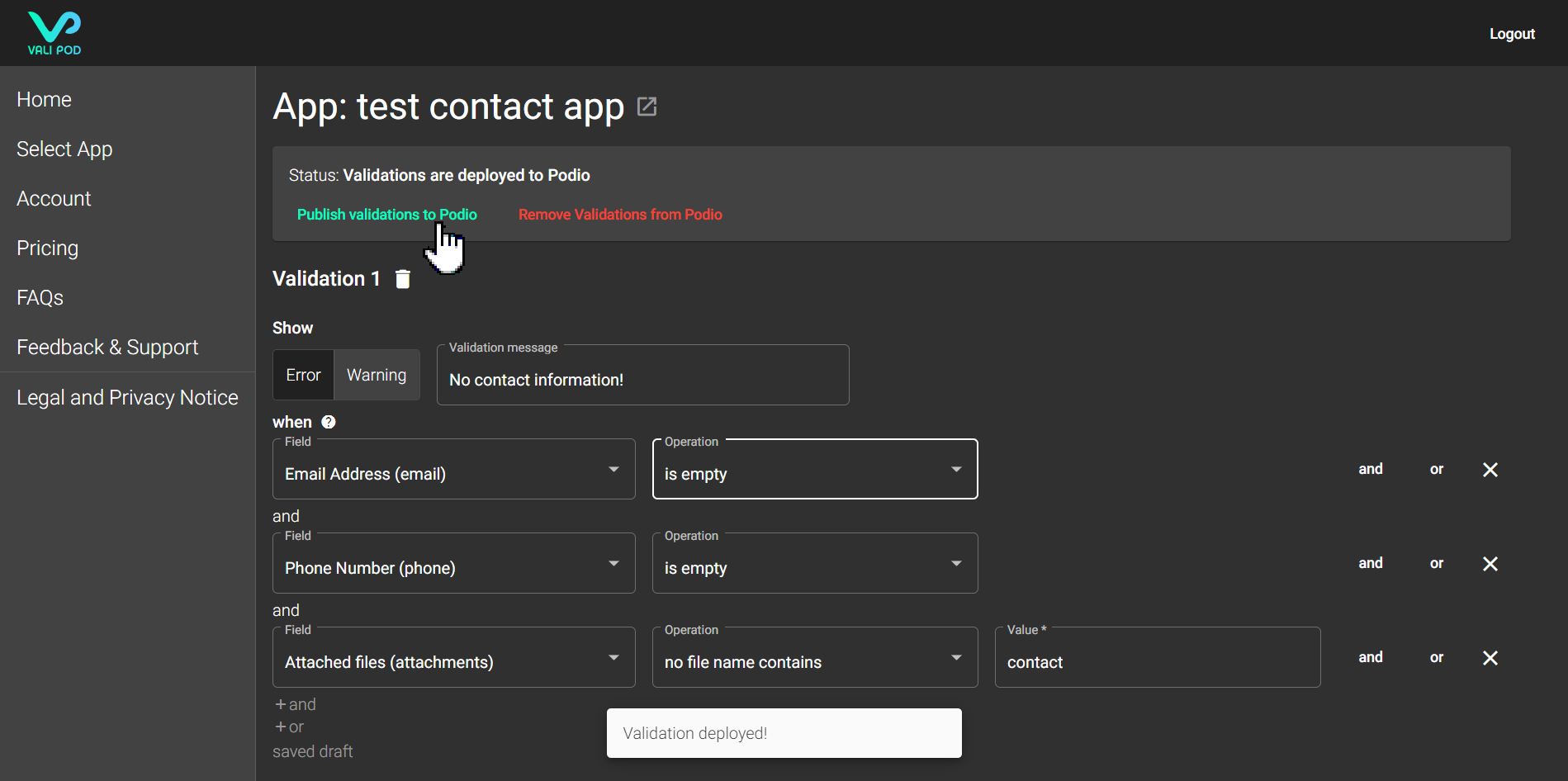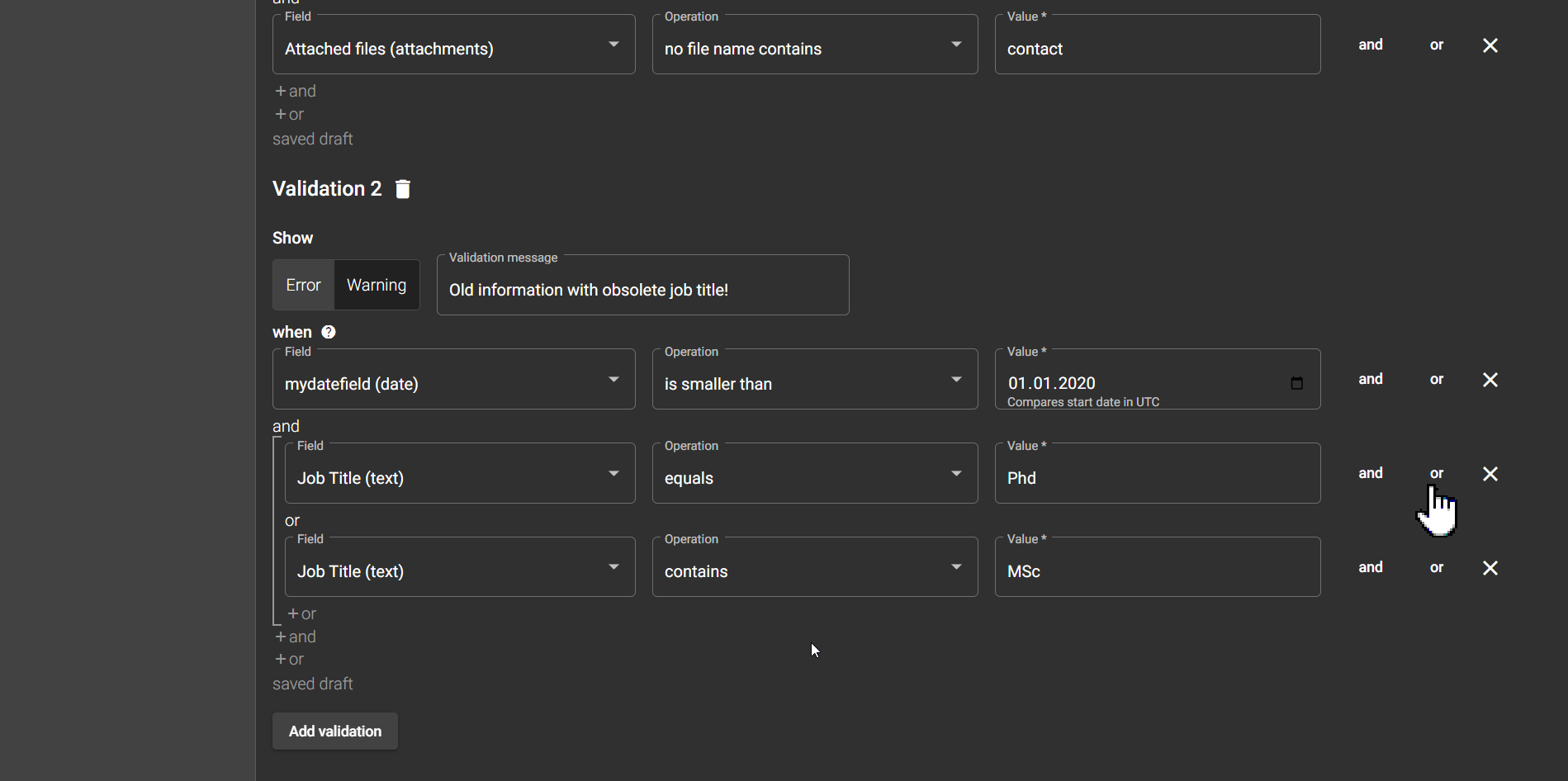 Validations check if values of multiple fields and attachments match given rules. When this happens, a validation message is shown to the user in the specific item.