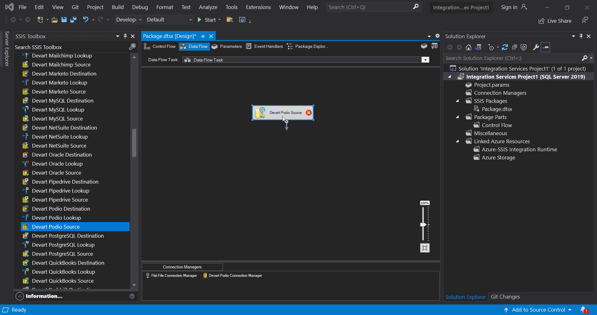 Devart SSIS Data Flow Components for Podio allow you to integrate Podio Items, Tasks, and other objects with other cloud applications and databases via SQL Server Integration Services (SSIS). They include optimized Podio Source, Podio Destination, and Podio Lookup components and provide their own Podio Connection Manager.