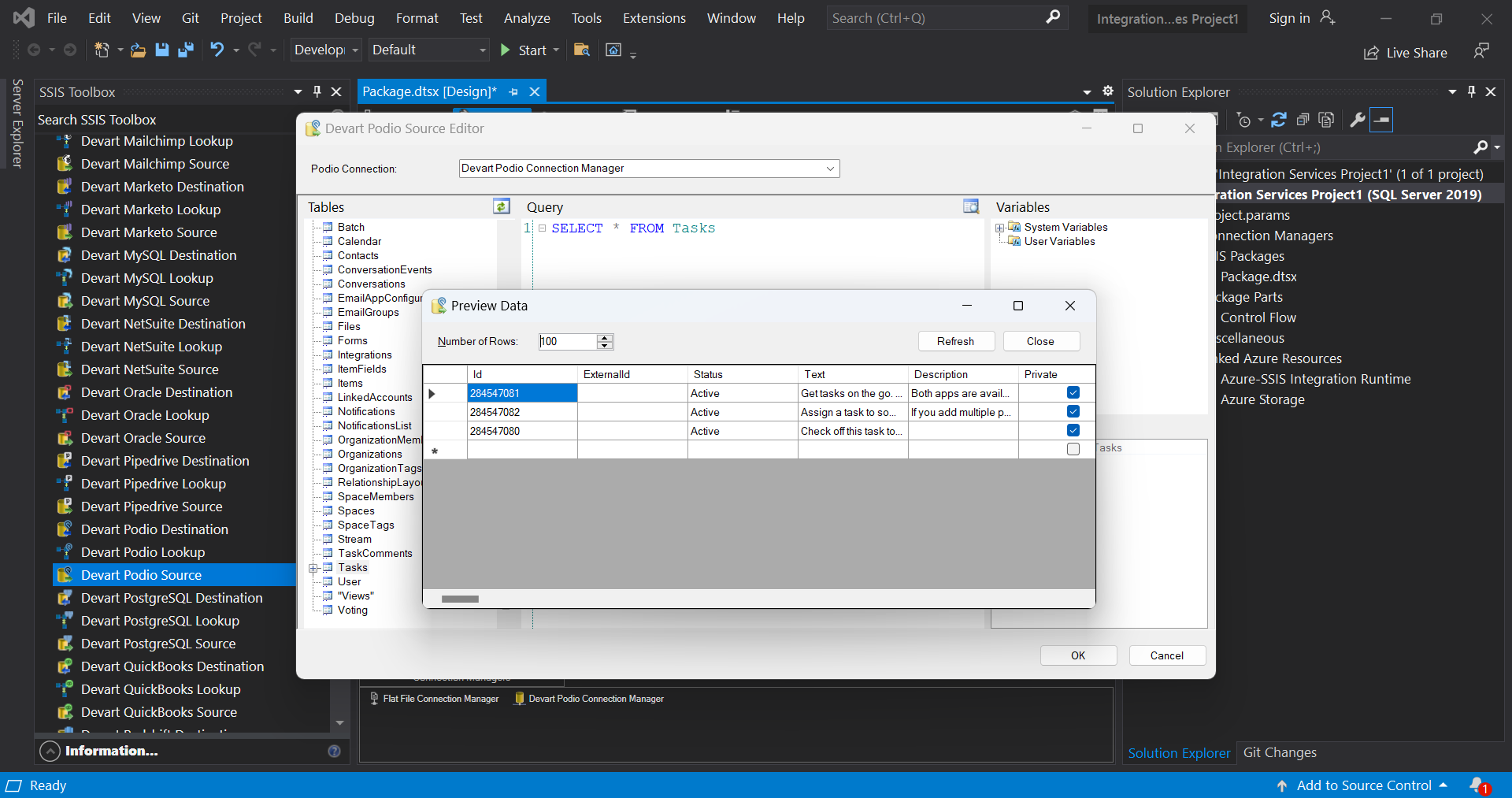 Devart Podio Source component offers a convenient editor, which displays all the Podio objects and their fields and allows you to quickly build a query to Podio via drag-n-drop. It also displays the list of available system and user variables of the package, allowing you to quickly add them to your select statements. If necessary, you can also quickly preview data, returned by the source, and check whether you query returns what you need.