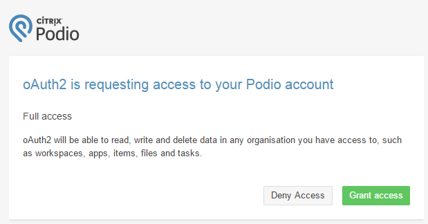 The free oAuth2 app allows you to add API services and obtain access tokens through the oAuth2 process right in Podio using Workflow Automations. This allows the stored access tokens to be used throughout your workspaces in Remote Post/Get actions in Workflow Automations. It puts API services like Google, Podio, MailChimp at your disposal.