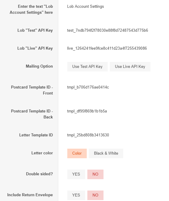 Lob Account Settings