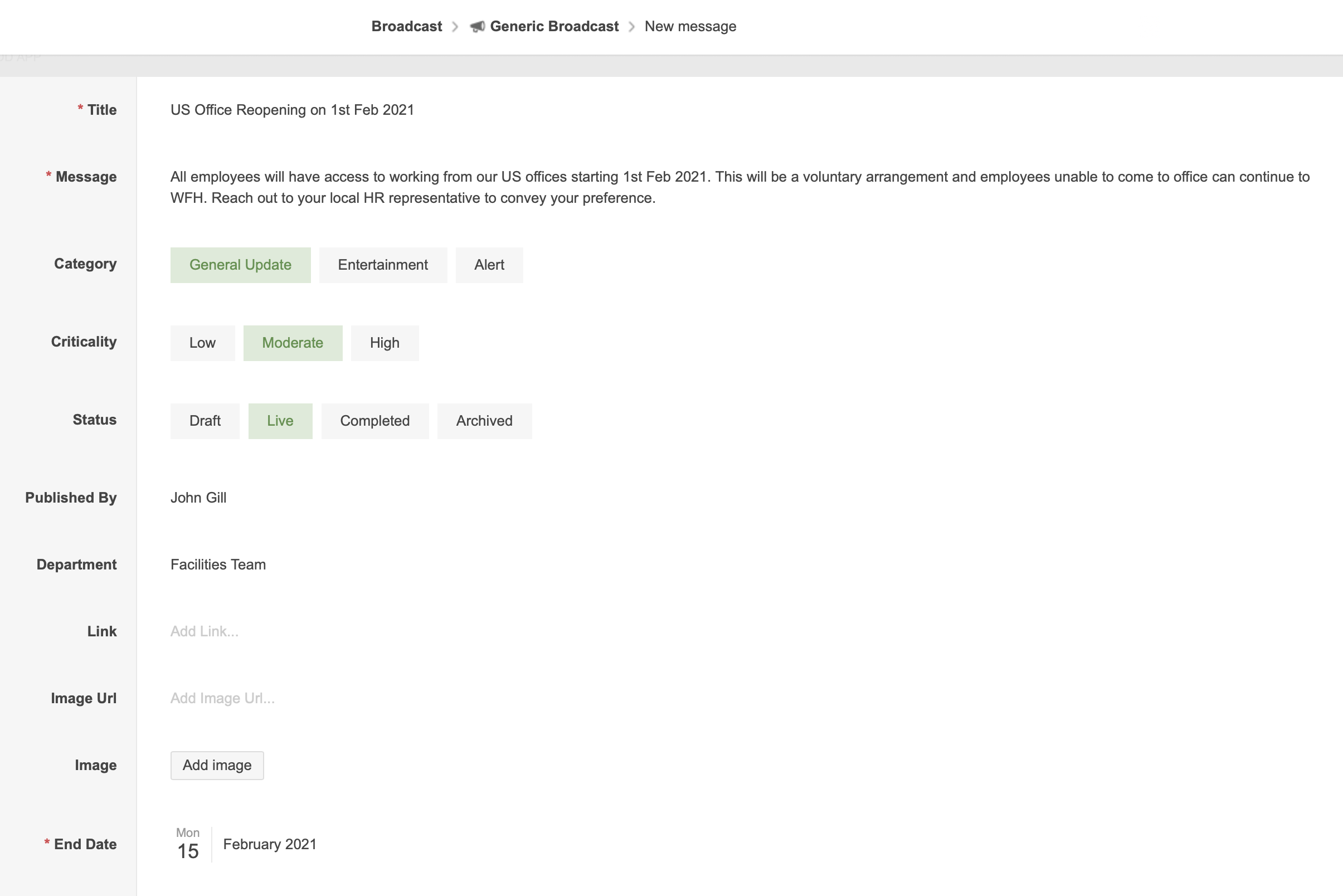 Use this Broadcast app to compose and share important announcements with your team. These announcements could be for general, facility or IT updates, change in processes, critical crisis communication or just engaging your team with some entertainment and well-being news. Your team can "subscribe" to these broadcast messages by clicking the "Follow this app" icon.