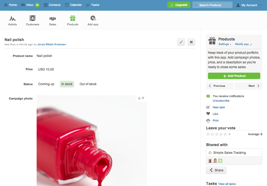 Keep track of your product portfolio with this app. Add campaign photos, price, and a description.