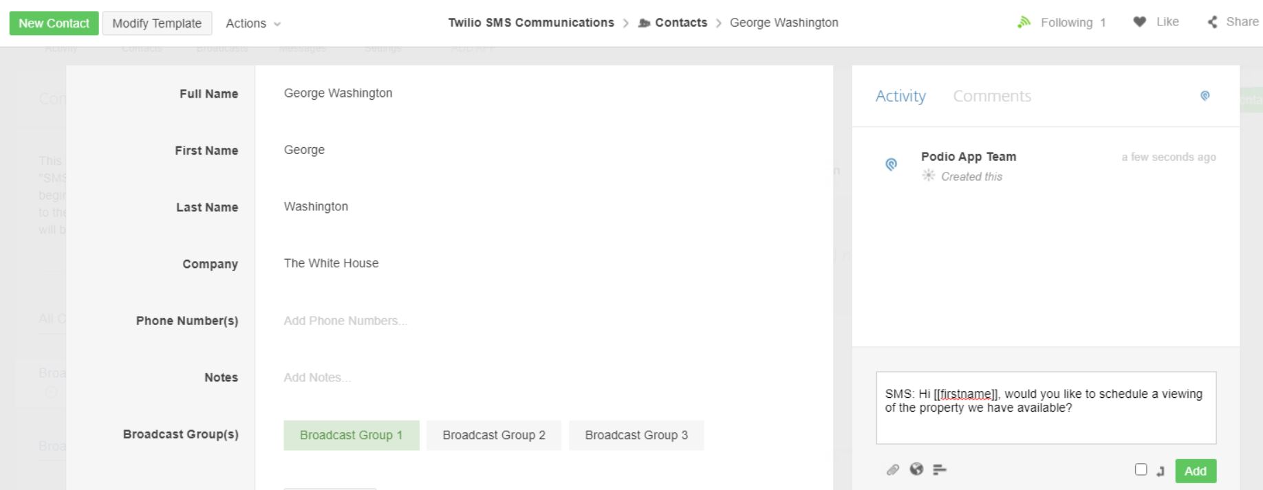Combined with a Twilio account, this pack manages two-way text message communications with all your contacts, including broadcasts to groups of contacts.