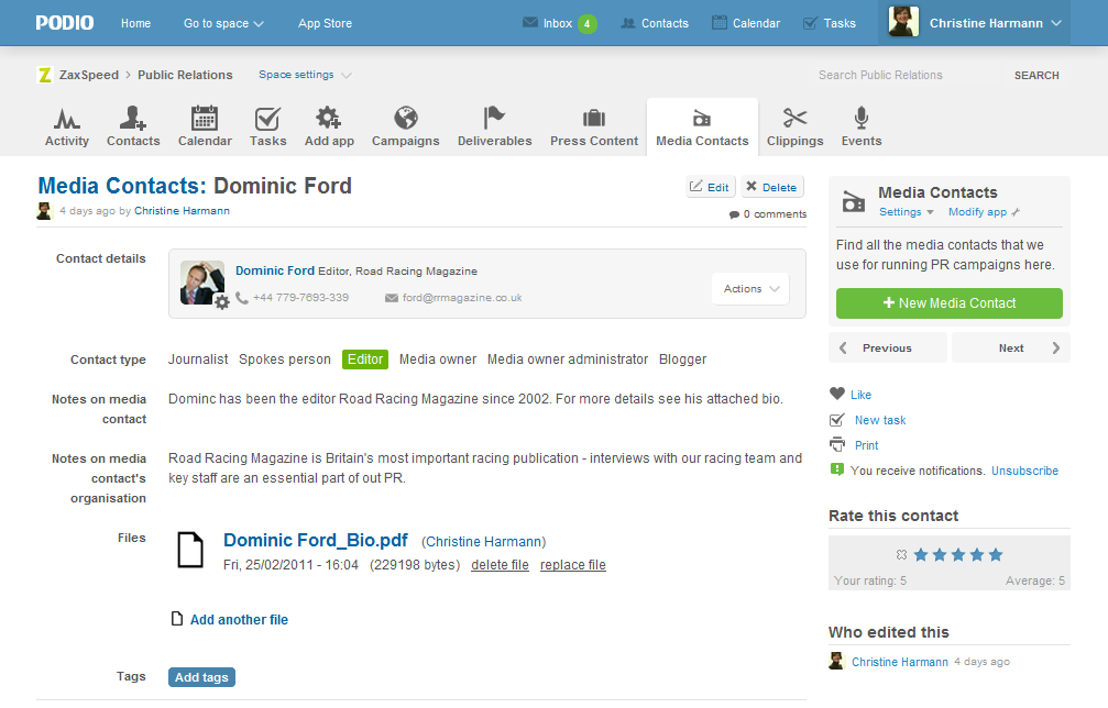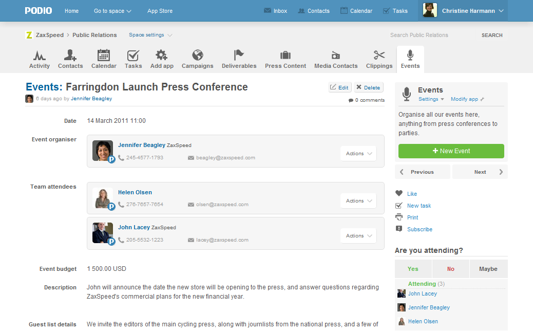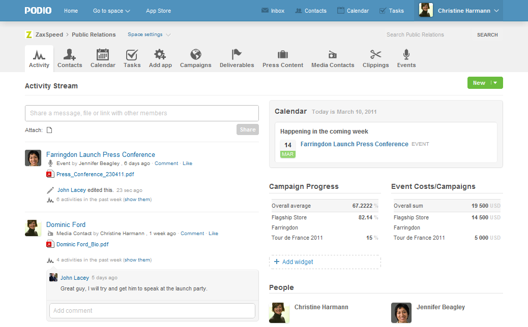 The Public Relations pack contains everything your team needs to manage your company's PR. Store all the essential information you need for communicating with the press; from key employee biographies, to the company fact sheet. Share your media contacts with your team and add notes on when best to use them. Create concise briefs and manage full PR campaigns by assigning deliverables for your team to work on, and setting the all important deadlines and budgets. With Podio reporting you get an overview of campaign preparation progress, and campaign event costs, on your spaces home page. Also, organise your press conferences and even parties - all with this pack!